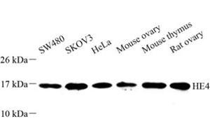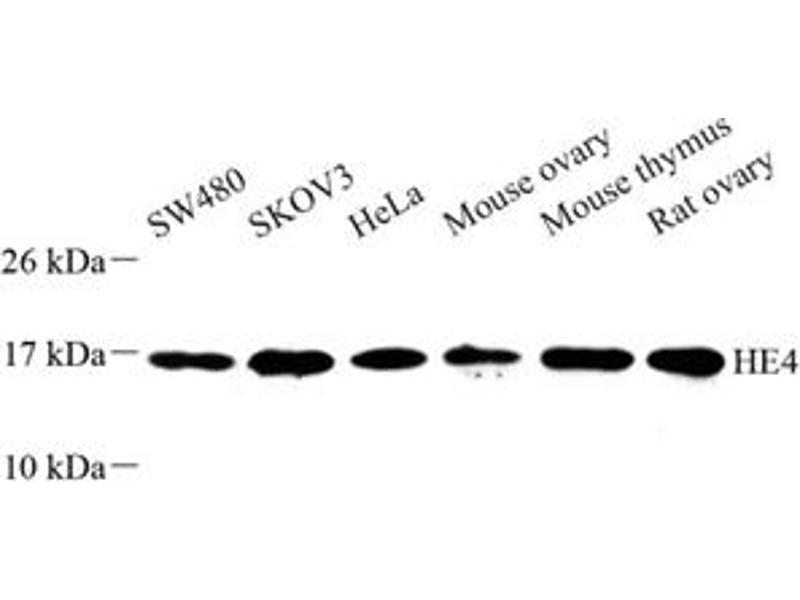 WFDC2, also named as HE4, is a member of the WFDC domain family. The WFDC domain, or WAP Signature motif, contains eight cysteines forming four disulfide bonds at the core of the protein, and functions as a protease inhibitor in many family members. In some study, HE4 was referred to as a biomarker for ovarian carcinoma.