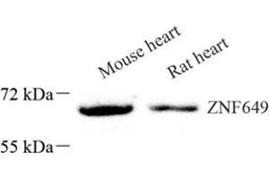ZNF649, also named as Zinc finger protein 649, is a 505 amino acid protein, which contains The one KRAB domain and belongs to the krueppel C2H2-type zinc-finger protein family. ZNF649 is highly expressed in heart, skeletal muscle, and brain and lower expression in liver, lung, kidney, pancreas and placenta. ZNF649 as a regulator of transcriptional factor complexes may suppress SRE and AP-1 transcription activities by growth factor signaling pathways.