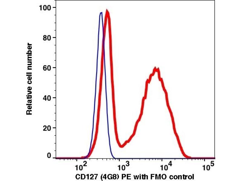 The clone 4G8, a mouse monoclonal antibody selectively recognizes a 60-90 kDa surface type 1 transmembrane glycoprotein antigen known as CD127 or IL-7 receptor α chain (IL-7Rα). CD127 forms a heterodimer with the common γ chain of the receptors of several cytokines such as IL-2, IL-4, IL-9, IL-13, IL-15, and IL-21. It is widely expressed on different subsets of B cells, peripheral T cells and bone marrow stromal cells. CD127 plays important role in the generation of memory and effector T cells as well as functional B cells.