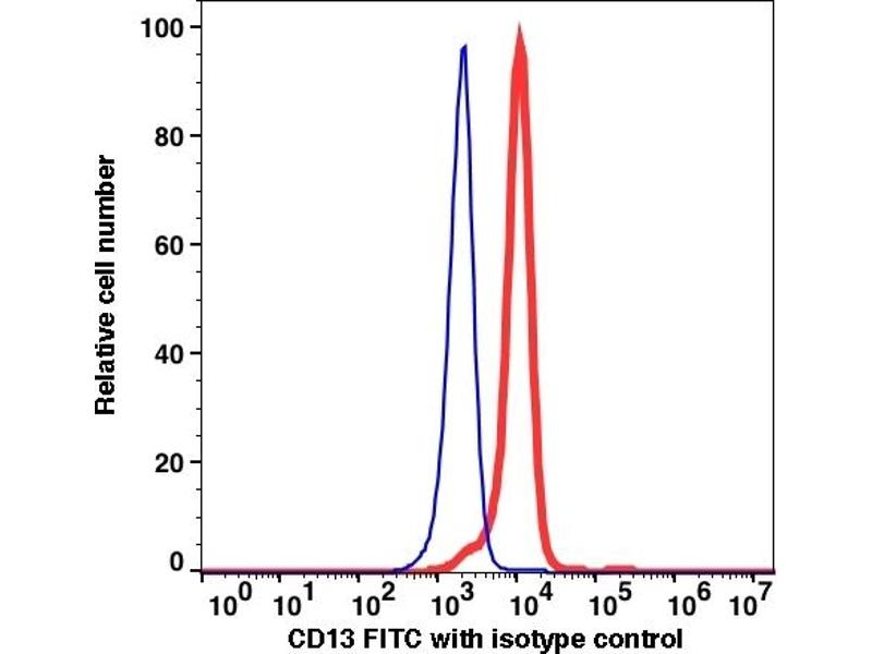 Clone APN1464 recognizes cell surface CD13 antigen, a 150 kDa membrane glycoprotein. The CD13 antigen is highly expressed mostly on myeloid-derived hematopoietic cells including granulocytes, monocytes, mast cells, and GM-progenitor cells. CD13 abundantly expresses on most of the malignant cells of myeloid origin such as AML, CML and also on smaller subset of cancer cells of lymphoid origin. Normal lymphocytes, platelets and erythrocytes do not express CD13. CD13 plays important role in metabolism of biologically active peptides, in phagocytosis, and in bactericidal/tumoricidal immune process. It also serves as a receptor for human coronaviruses (HCV).