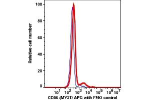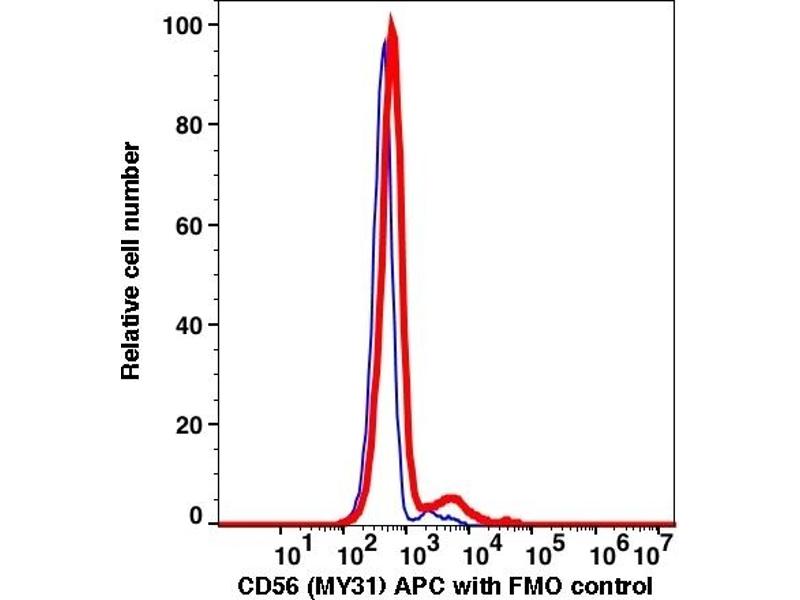 Clone MY31, a mouse antibody, binds to the human 140- kDa glycoprotein, an isoform of neural cell adhesion molecule (NCAM) known as CD56. CD56 and CD16 expressing lymphocytes are primarily considered as human NK cells and NK-T cells. A subset of CD56+ NK cells play a unique functional role in the innate immune response as the primary source of NK cell-derived immunoregulatory cytokines, regulated in part by differential monokine production. CD56 is also expressed in normal and neoplastic human neuroendocrine tissues, certain large granular lymphocyte (LGL) leukemias, small-cell lung carcinomas, neuronal derived tumors, myelomas, and myeloid leukemias. Increased CD56 + lymphocyte subsets in peripheral blood has a significant predictive or prognostic factor in metastatic breast cancer.