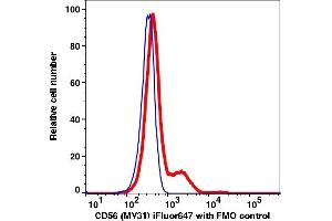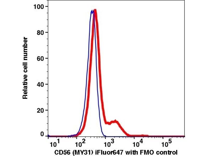 Clone MY31, a mouse antibody, binds to the human 140- kDa glycoprotein, an isoform of neural cell adhesion molecule (NCAM) known as CD56. CD56 and CD16 expressing lymphocytes are primarily considered as human NK cells and NK-T cells. A subset of CD56+ NK cells play a unique functional role in the innate immune response as the primary source of NK cell-derived immunoregulatory cytokines, regulated in part by differential monokine production. CD56 is also expressed in normal and neoplastic human neuroendocrine tissues, certain large granular lymphocyte (LGL) leukemias, small-cell lung carcinomas, neuronal derived tumors, myelomas, and myeloid leukemias. Increased CD56 + lymphocyte subsets in peripheral blood has a significant predictive or prognostic factor in metastatic breast cancer.