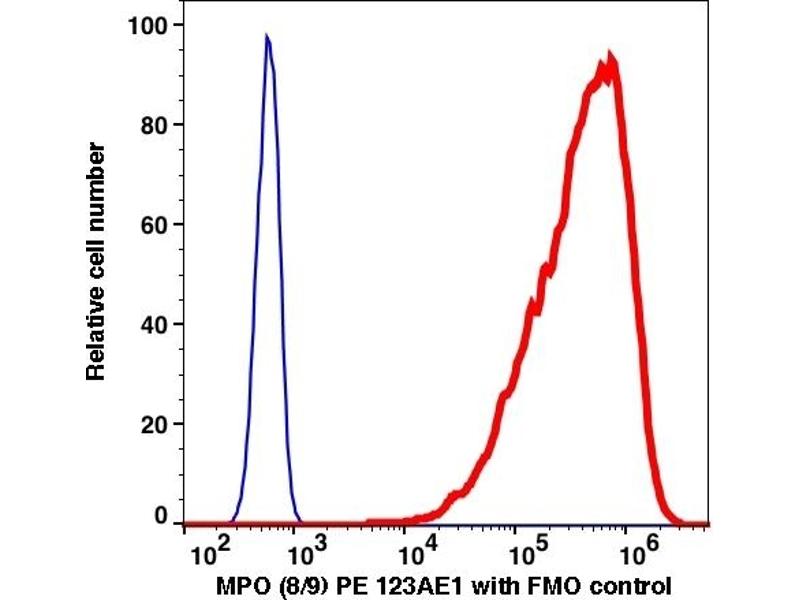 - The clone 8/9, a mouse monoclonal antibody selectively binds with myeloperoxidase (MPO), a glycoprotein present in the granules of myeloid cells. MPO is critical for an optimal oxygen-dependent microbicidal activity of myeloid cells. The MPO generally appears in the myeloblast stage of myeloid cell differentiation. It is the most common functional protein of myeloid cells and is involved in the process of inflammatory immune responses mediated by myeloid cells. The primary translation product of MPO undergoes glycosylation with the production of 89 kDa heme-free apopro-MPO form followed by incorporation of heme and conversion into the enzymatically active pro-MPO form. Subsequently, pro-MPO becomes targeted to azurophil granules where final processing occurs to produce mature dimeric MPO consisting of the 59-64 kDa MPO alpha-chain and the 14 kDa MPO beta-chain. MPO gene expression may serve as an additional marker for subclassification of acute leukemias and may be used to identify leukemic cells arrested at an early stage of the myeloid differentiation pathway.