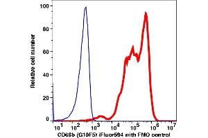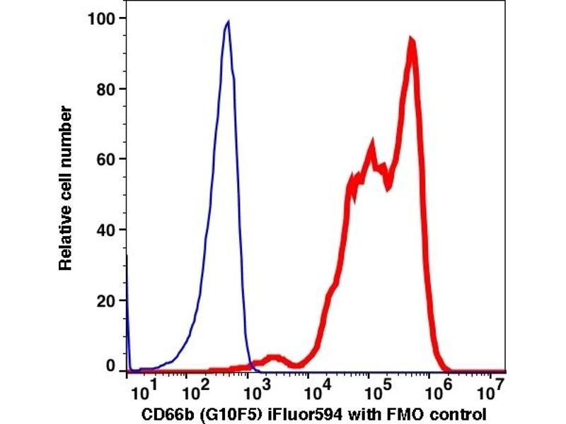G10F5 recognizes 95-100 kD glycosylphosphatidylinositol (GPI)-linked protein known as CD66b. CD66b is a member of carcinoembryonic antigen (CEA)-like subfamily of the immunoglobulin superfamily and considered as a non-specific cross-reacting antigens (NCA) which is increased in granulocytes after in vitro stimulation with Ca2+, PMA. It is mostly expressed on granulocytes and causes activation of neutrophils through reacting heterophilic adhesion with CD66c. Research findings suggest CD66b is useful in the study of various normal and pathological conditions, including: cancer, embryonic development, bacterial infection, viral infection, inflammation, pregnancy, bile transport, cell adhesion, etc.