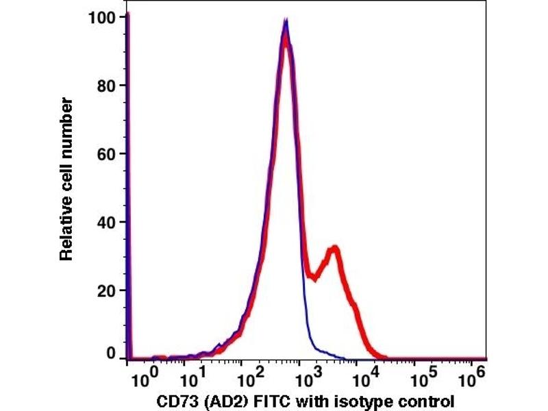 - The clone AD2, a mouse monoclonal antibody recognizes a 70kD glycophosphatidylinositol (GPI)-linked 5'nucleotidase (or 5'-Ecto-nucleotidase) cell surface antigen known as CD73. It is widely expressed on various immune as well as non-immune cells including T and B cells, mesenchymal stem cells, follicular dendritic cells, endothelial cells, epithelial cells, etc. CD73 catalyzes the conversion of extracellular nucleosides to adenosine and modulates immune responses. Administration of CD73 inhibits metastasis formation in human breast cancer by inducing clustering and internalization of CD73 expressed on the surface of cancer cells.