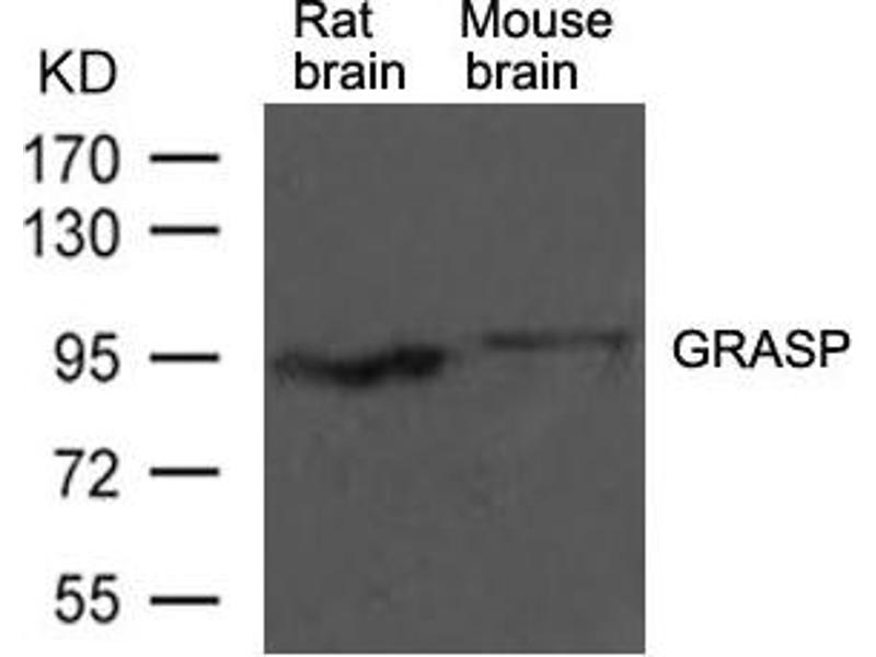 Background: GRASP (GRP1-associated scaffold protein, tamalin) is a 395 amino acid proteinencoded by the human gene GRASP . GRASP is a scaffold protein that com-prises multiple protein-interacting domains, including a 95 kDa postsynaptic density protein (PSD-95)/discs-large/ZO-1 (PDZ) domain, a leucine-zipperregion and a carboxyl-terminal PDZ-binding motif. GRASP is involved with intracellular trafficking and contributes to the macromolecular organization of group 1 metabotropic glutamate receptors (mGluRs) at synapses. GRASP forms a heteromer composed of GRASP , PSCD2 and at least one mGluR-1. It also interacts with PSCD3, mGluR-2, mGluR-3 and mGluR-5. GRASP is highly expressed in brain and has lower levels of expression in lung, heart, embryo, kidney and ovary.