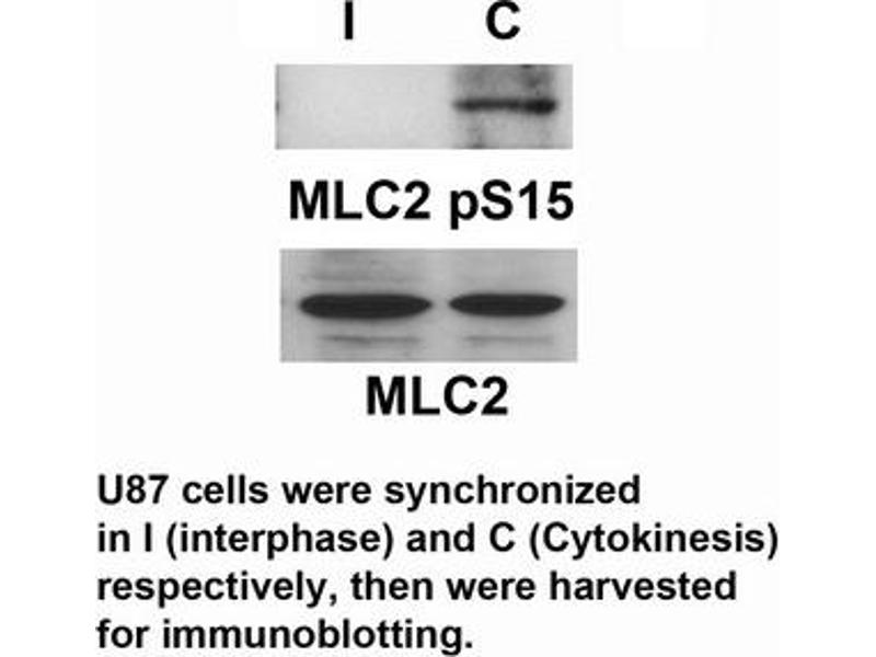 Myosin regulatory subunit that plays an important role in regulation of both smooth muscle and nonmuscle cell contractile activity via its phosphorylation. Implicated in cytokinesis, receptor capping, and cell locomotion.1) Xia, Y. et al. c-Jun downregulation by HDAC3-dependent transcriptional repression promotes osmotic stress-induced cell apoptosis. Mol. Cell 25, 219–232 (2007).2)Vander Heiden, M. G. et al. Evidence for an alternative glycolytic pathway in rapidly proliferating cells. Science 329, 1492–1499 (2010).3) Fang, D. et al. Phosphorylation of beta-catenin by AKT promotes beta-catenin transcriptional activity. J. Biol. Chem. 282, 11221–11229 (2007).Aliases: 20 kDa myosin light chain antibody; Human 20kDa myosin light chain (MLC2) mRNA complete cds antibody; LC20 antibody; MGC3505 antibody; MLC 2 antibody; MLC-2C antibody; MLC2 antibody; MLY 9 antibody; MRLC1 antibody; MYL9 antibody; MYL9_HUMAN antibody; Myosin light chain 9 regulatory antibody; Myosin light polypeptide 9 regulatory antibody; myosin regulatory light chain 1 antibody; Myosin regulatory light chain 2 antibody; Myosin regulatory light chain 2 smooth muscle isoform antibody; Myosin regulatory light chain 9 antibody; Myosin regulatory light chain MRLC1 antibody; Myosin regulatory light polypeptide 9 antibody; Myosin RLC antibody; Myosin vascular smooth muscle light chain 2 antibody; MYRL2 antibody; OTTHUMP00000030857 antibody; smooth muscle isoform antibody
