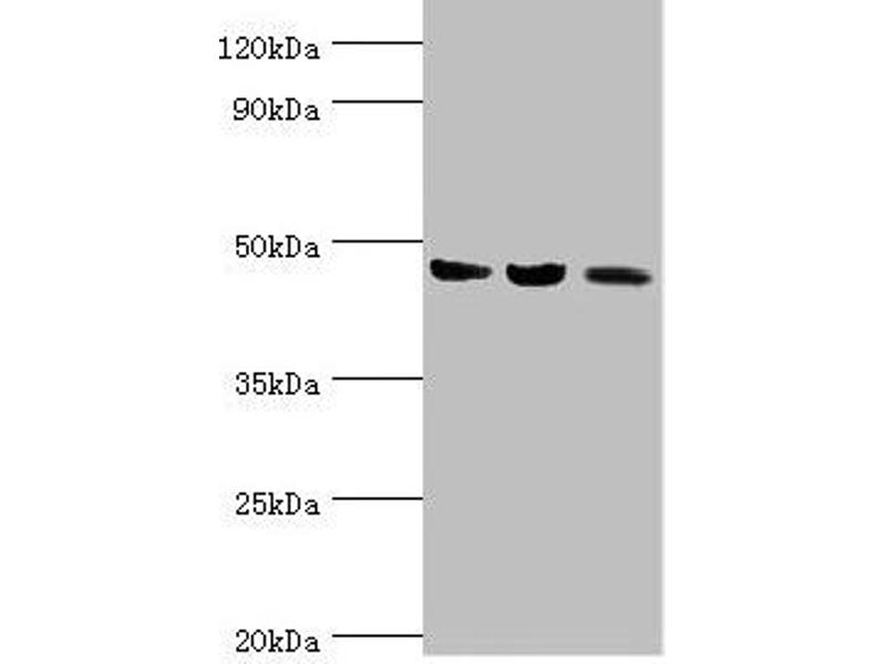 Aliases: ACAT 1 antibody, ACAT antibody, acat1 antibody, Acetoacetyl CoA thiolase antibody, acetoacetyl Coenzyme A thiolase antibody, Acetoacetyl-CoA thiolase antibody, Acetyl CoA acetyltransferase, mitochondrial antibody, Acetyl Coenzyme A acetyltransferase 1 antibody, Acetyl-CoA acetyltransferase antibody, acetyl-coa acetyltransferase precursor, mitochondrial antibody, Acetyl-CoA thiolase, mitochondrial antibody, acetyl-Coenzyme A acetyltransferase 1 antibody, MAT antibody, mitochondrial acetoacetyl-CoA thiolase antibody, mitochondrial antibody, RATACAL antibody, T2 antibody, testicular tissue protein Li 198 antibody, THIL antibody, THIL_HUMAN antibody