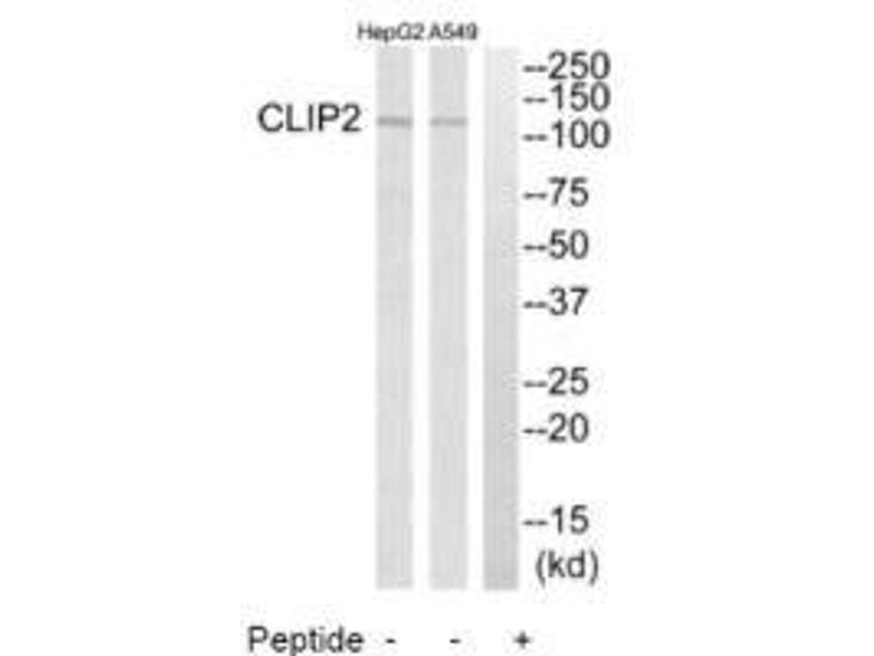 Hillier L.W., Nature 424:157-164(2003).Aliases: CAP GLY domain containing linker protein 2 antibody, CAP-Gly domain-containing linker protein 2 antibody, CLIP 115 antibody, CLIP antibody, CLIP-115 antibody, Clip2 antibody, CLIP2_HUMAN antibody, cytoplasmic linker 2 antibody, Cytoplasmic linker protein 115 antibody, Cytoplasmic linker protein 2 antibody, KIAA0291 antibody, MGC11333 antibody, restin antibody, Similar to RESTIN (CYTOPLASMIC LINKER PROTEIN 170 ALPHA 2) antibody, WBSCR3 antibody, WBSCR4 antibody, Williams Beuren syndrome chromosome region 3 antibody, Williams Beuren syndrome chromosome region 4 antibody, Williams-Beuren syndrome chromosomal region 3 protein antibody, Williams-Beuren syndrome chromosomal region 4 protein antibody, WSCR3 antibody, WSCR4 antibody