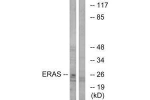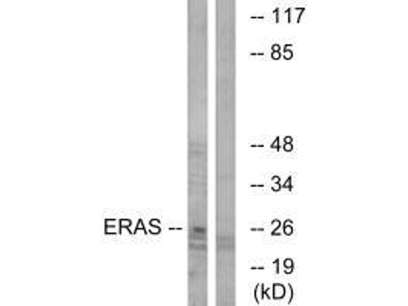 Aliases: E ras antibody, E-Ras antibody, ecat5 antibody, Embryonic stem cell expressed Ras antibody, Embryonic stem cell-expressed Ras antibody, Eras antibody, ES cell expressed Ras antibody, GTPase ERas antibody, Ha-Ras2 antibody, HRAS2 antibody, HRASP antibody, MGC126691 antibody, MGC126693 antibody, OTTHUMP00000065857 antibody, RASE_HUMAN antibody, Small GTPase protein E Ras antibody, v Ha ras Harvey rat sarcoma viral oncogene homolog pseudogene antibody, v Ha ras Harvey rat sarcoma viral oncogene homolog 2 antibody