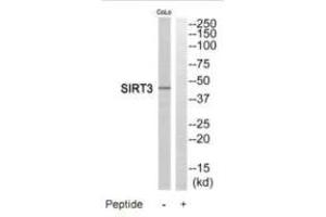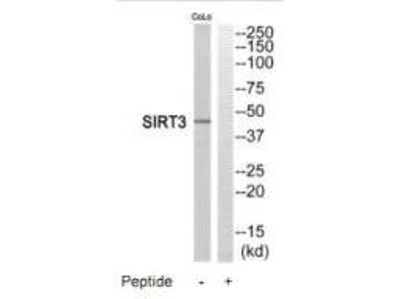 Onyango P., Proc. Natl. Acad. Sci. U.S.A. 99:13653-13658(2002).Aliases: hSIRT 3 antibody, hSIRT3 antibody, Mitochondrial nicotinamide adenine dinucleotide dependent deacetylase antibody, NAD dependent deacetylase sirtuin 3 mitochondrial antibody, NAD-dependent protein deacetylase sirtuin-3, mitochondrial antibody, Regulatory protein SIR2 homolog 3 antibody, Silent mating type information regulation 2 S.cerevisiae homolog 3 antibody, Sir 2 like 3 antibody, SIR 2 like protein 3 antibody, SIR 3 antibody, SIR2 L3 antibody, Sir2 like 3 antibody, SIR2 like protein 3 antibody, SIR2-like protein 3 antibody, SIR2L3 antibody, SIR3_HUMAN antibody, SIRT 3 antibody, SIRT3 antibody, Sirtuin 3 antibody, Sirtuin silent mating type information regulation 2 homolog 3 (S. cerevisiae) antibody, Sirtuin type 3 antibody, Sirtuin3 antibody