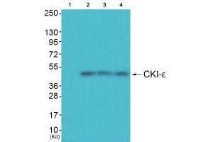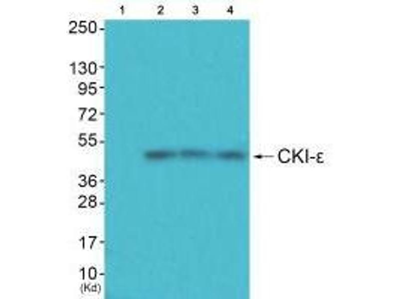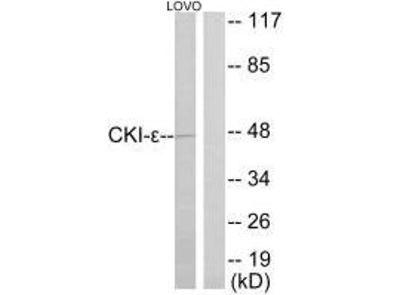 Collins J.E., Genome Biol. 5:RESEARCH84.1-RESEARCH84.11(2004).Aliases: Casein kinase 1 epsilon antibody, Casein kinase I antibody, Casein kinase I epsilon antibody, Casein kinase I isoform epsilon antibody, CKI epsilon antibody, CKI-epsilon antibody, CKIe antibody, CKIepsilon antibody, CSNK 1E antibody, CSNK1E antibody, DBT antibody, Doubletime, Drosophila, homolog of antibody, EC 2.7.11.1 antibody, epsilon isoform antibody, HCK IE antibody, KC1E antibody, KC1E_HUMAN antibody, kinase CK1 epsilon antibody, MGC 10398 antibody