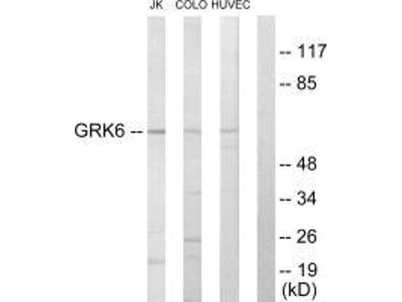 Stoffel R.H., J. Biol. Chem. 269:27791-27794(1994).Aliases: FLJ32135 antibody, G protein coupled receptor kinase 6 antibody, G protein coupled receptor kinase GRK6 antibody, G protein-coupled receptor kinase 6 antibody, G protein-coupled receptor kinase GRK6 antibody, Gprk6 antibody, Grk6 antibody, GRK6_HUMAN antibody