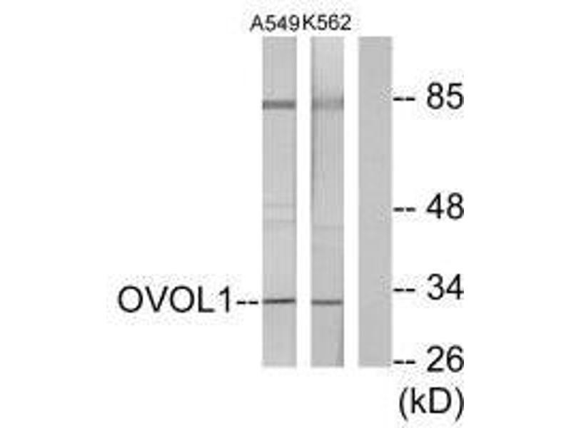 Chidambaram A., Mamm. Genome 8:950-951(1997).Aliases: hOvo1 antibody, Ovo homolog like 1 antibody, Ovo like 1(Drosophila) antibody, Ovo, Drosophila, homolog-like, 1 antibody, Ovol1 antibody, OVOL1_HUMAN antibody, Putative transcription factor Ovo like 1 antibody, Putative transcription factor Ovo-like 1 antibody