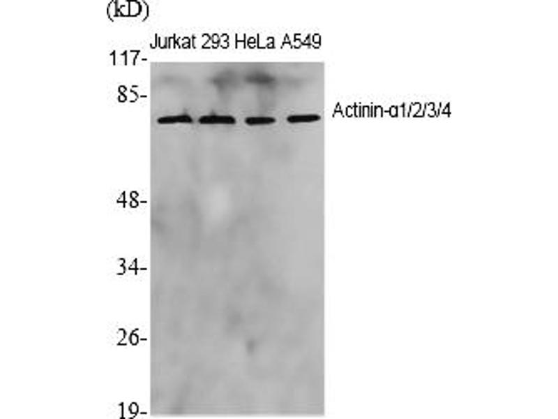 Rabbit Anti-Actinin-α1/2/3/4 Polyclonal Antibody,ACTN1, Alpha-actinin-1, Alpha-actinin cytoskeletal isoform, F-actin cross-linking protein, Non-muscle alpha-actinin-1, ACTN2, Alpha-actinin-2, Alpha-actinin skeletal muscle isoform 2, F-actin cross-linking protein, ACTN3, Alpha-actinin-3, A,Alpha actinins belong to the spectrin gene superfamily which represents a diverse group of cytoskeletal proteins, including the alpha and beta spectrins and dystrophins. Alpha actinin is an actin-binding protein with multiple roles in different cell types. In nonmuscle cells, the cytoskeletal isoform is found along microfilament bundles and adherens-type junctions, where it is involved in binding actin to the membrane. In contrast, skeletal, cardiac, and smooth muscle isoforms are localized to the Z-disc and analogous dense bodies, where they help anchor the myofibrillar actin filaments. ACTN1 encodes a nonmuscle, cytoskeletal, alpha actinin isoform and maps to the same site as the structurally similar erythroid beta spectrin gene. Three transcript variants encoding different isoforms have been found for ACTN1.,Alpha-actinin-1