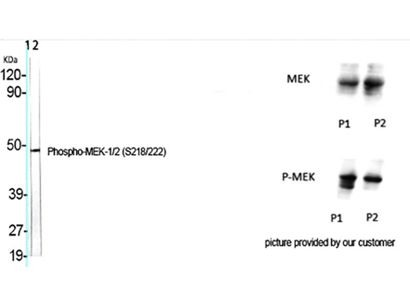 - Rabbit Anti-MEK-1/2 (phospho Ser218/222) Polyclonal Antibody,MAP2K1, MEK1, PRKMK1, Dual specificity mitogen-activated protein kinase kinase 1, MAP kinase kinase 1, MAPKK 1, MKK1, ERK activator kinase 1, MAPK/ERK kinase 1, MEK 1, MAP2K2, MEK2, MKK2, PRKMK2, Dual specificity mitogen-activated protein k,Mitogen-activated protein kinase 1 encoded by MAP2K1 is a member of the dual specificity protein kinase family, which acts as a mitogen-activated protein (MAP) kinase kinase. MAP kinases, also known as extracellular signal-regulated kinases (ERKs), act as an integration point for multiple biochemical signals. Mitogen-activated protein kinase 1 lies upstream of MAP kinases and stimulates the enzymatic activity of MAP kinases upon wide variety of extra- and intracellular signals. As an essential component of MAP kinase signal transduction pathway,Mitogen-activated protein kinase 1 is involved in many cellular processes such as proliferation, differentiation, transcription regulation and development.,Dual specificity mitogen-activated protein kinase kinase 1