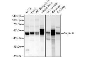 This gene is a member of the septin family of nucleotide binding proteins, originally described in yeast as cell division cycle regulatory proteins. Septins are highly conserved in yeast, Drosophila, and mouse, and appear to regulate cytoskeletal organization. Disruption of septin function disturbs cytokinesis and results in large multinucleate or polyploid cells. Multiple alternatively spliced transcript variants encoding different isoforms have been found for this gene.,SEPT8,42980,SEP2,septin-8,Cell Biology & Developmental Biology,Cell Cycle,Immunology & Inflammation,Cytokines,8-Sep