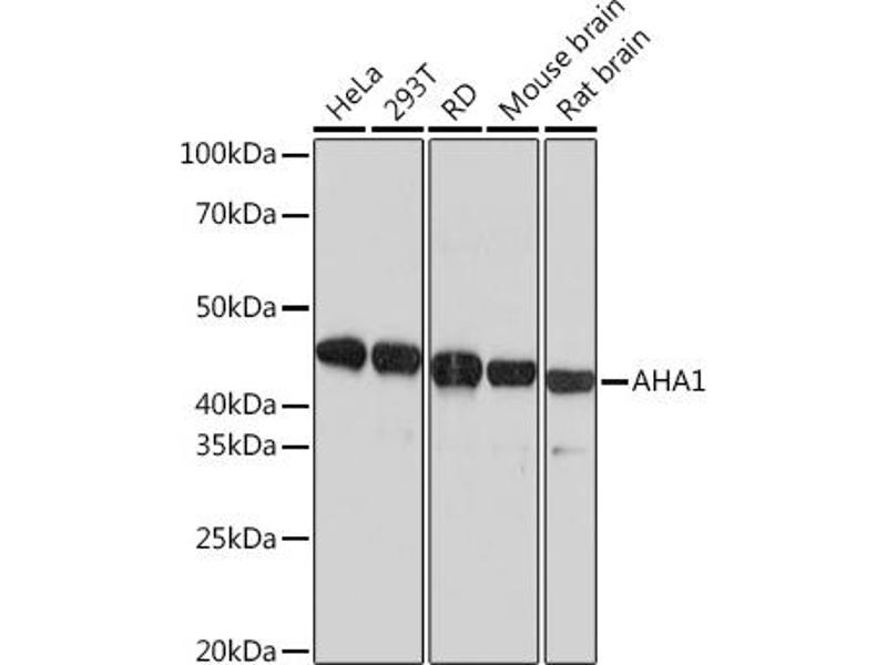 AHA-1 stimulates the inherent ATPase activity of yeast and human HSP 90 and interacts with the cytoplasmic tail of vesticular stomatitis virus glycoprotein. AHA-1 regulates HSP 90 by influencing the conformational state of the ""ATP lid"" and consequent N-terminal dimerization. It is crucial for cell viability under non-optimal growth conditions when HSP 90 levels are limiting. AHA-1 is a cytosolic protein and may transiently interact with the endoplasmic reticulum. It can have an affect on one step in the endoplasmic to Golgi trafficking. AHA-1 is expressed in numerous tissues, including brain, heart, skeletal muscle and kidney and, at lower levels, in liver and placenta. It is induced by heat shock and treatment with the HSP 90 inhibitor 17-demeth-oxygeldanamycin.,AHA1, C14orf3, hAha1, p38,Signal Transduction,AHSA1