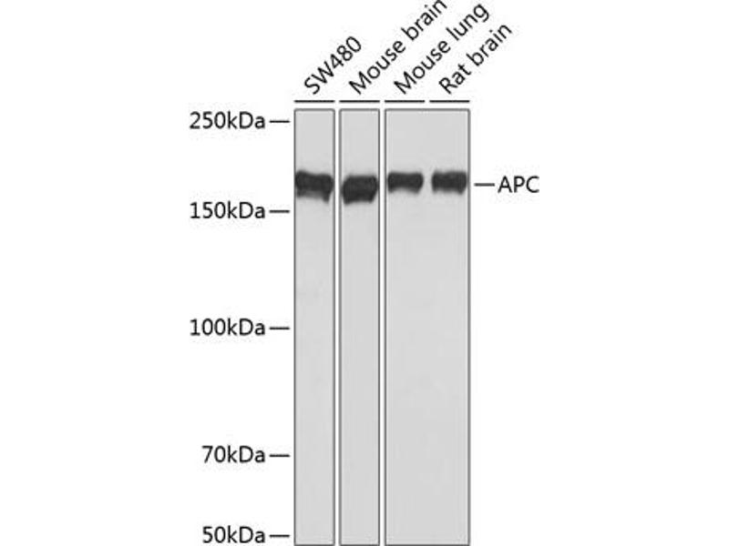 This gene encodes a tumor suppressor protein that acts as an antagonist of the Wnt signaling pathway. It is also involved in other processes including cell migration and adhesion, transcriptional activation, and apoptosis. Defects in this gene cause familial adenomatous polyposis (FAP), an autosomal dominant pre-malignant disease that usually progresses to malignancy. Disease-associated mutations tend to be clustered in a small region designated the mutation cluster region (MCR) and result in a truncated protein product. [provided by RefSeq, Jul 2008],APC,BTPS2,DP2,DP2.5,DP3,GS,PPP1R46,Apoptosis,Cancer,Cardiovascular,Cell Adhesion,Cell Biology & Developmental Biology,Cell Cycle,Cell Cycle_Centrosome,Cell Type Marker,Cell Type Marker_Oligodendrocyte marker,Cytoskeleton_Microtubules,Epigenetics & Nuclear Signaling,ESC Pluripotency and Differentiation,Heart,Heart_Cardiogenesis,Neuroscience,Signal Transduction,Stem Cells,Transcription Factors,Tumor suppressors,Wnt/β-Catenin Signaling Pathway,APC