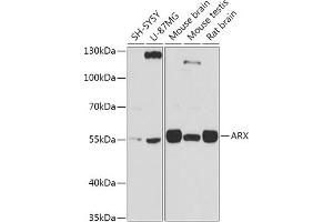 This gene is a homeobox-containing gene expressed during development. The expressed protein contains two conserved domains, a C-peptide (or aristaless domain) and the prd-like class homeobox domain. It is a member of the group-II aristaless-related protein family whose members are expressed primarily in the central and/or peripheral nervous system. This gene is thought to be involved in CNS development. Expansion of a polyalanine tract and other mutations in this gene cause X-linked mental retardation and epilepsy.,ARX,CT121,EIEE1,ISSX,MRX29,MRX32,MRX33,MRX36,MRX38,MRX43,MRX54,MRX76,MRX87,MRXS1,PRTS,Epigenetics & Nuclear Signaling,Transcription Factors,Neuroscience,Dopamine Signaling in Parkinson's Disease,Neurodegenerative Diseases Markers,ARX