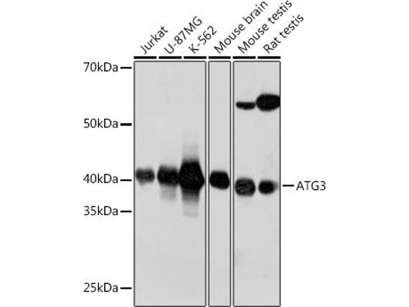 This gene encodes a ubiquitin-like-conjugating enzyme and is a component of ubiquitination-like systems involved in autophagy, the process of degradation, turnover and recycling of cytoplasmic constituents in eukaryotic cells. This protein is known to play a role in regulation of autophagy during cell death. A pseudogene of this gene is located on chromosome 20. Alternative splicing results in multiple transcript variants encoding different isoforms. [provided by RefSeq, Jul 2013],ATG3,APG3,APG3-LIKE,APG3L,PC3-96,Autophagy,Autophagy_ATGs,Cancer,Cardiovascular,Cell Biology & Developmental Biology,Endocrine & Metabolism,Heart,Mitochondrial metabolism,Neurodegenerative Diseases,Neuroscience,Signal Transduction,Tumor suppressors,Ubiquitin,ATG3