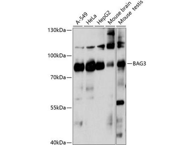 BAG proteins compete with Hip for binding to the Hsc70/Hsp70 ATPase domain and promote substrate release. All the BAG proteins have an approximately 45-amino acid BAG domain near the C terminus but differ markedly in their N-terminal regions. The protein encoded by this gene contains a WW domain in the N-terminal region and a BAG domain in the C-terminal region. The BAG domains of BAG1, BAG2, and BAG3 interact specifically with the Hsc70 ATPase domain in vitro and in mammalian cells. All 3 proteins bind with high affinity to the ATPase domain of Hsc70 and inhibit its chaperone activity in a Hip-repressible manner.,BAG3,BAG-3,BIS,CAIR-1,MFM6,Cancer,Invasion and Metastasis,Cell Biology & Developmental Biology,Apoptosis,Bcl 2 family,Endocrine & Metabolism,BAG3