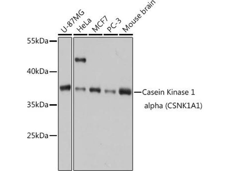 Casein kinases are operationally defined by their preferential utilization of acidic proteins such as caseins as substrates. It can phosphorylate a large number of proteins. Participates in Wnt signaling. Phosphorylates CTNNB1 at 'Ser-45'. May phosphorylate PER1 and PER2. May play a role in segregating chromosomes during mitosis. May play a role in keratin cytoskeleton disassembly and thereby, it may regulate epithelial cell migration.,CSNK1A1,CK1,CK1a,CKIa,HEL-S-77p,HLCDGP1,PRO2975,Signal Transduction,Kinase,Serine/threonine kinases,Cell Biology & Developmental Biology,Hedgehog Signaling Pathway,Wnt/β-Catenin Signaling Pathway,Stem Cells,CSNK1A1