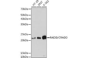 This gene encodes a protein containing a death domain (DD) motif. This protein recruits caspase 2/ICH1 to the cell death signal transduction complex, which includes tumor necrosis factor receptor 1 (TNFR1A) and RIPK1/RIP kinase, and acts in promoting apoptosis. A mutation in this gene was associated with mental retardation. A related pseudogene is found on chromosome 3. Alternative splicing results in multiple transcript variants. [provided by RefSeq, Feb 2016],MRT34, RAIDD,Apoptosis,Apoptosis_Mitochondrial Control of Apoptosis,Cancer,Cell Biology & Developmental Biology,Death Receptor Signaling Pathway,Invasion and Metastasis,CRADD