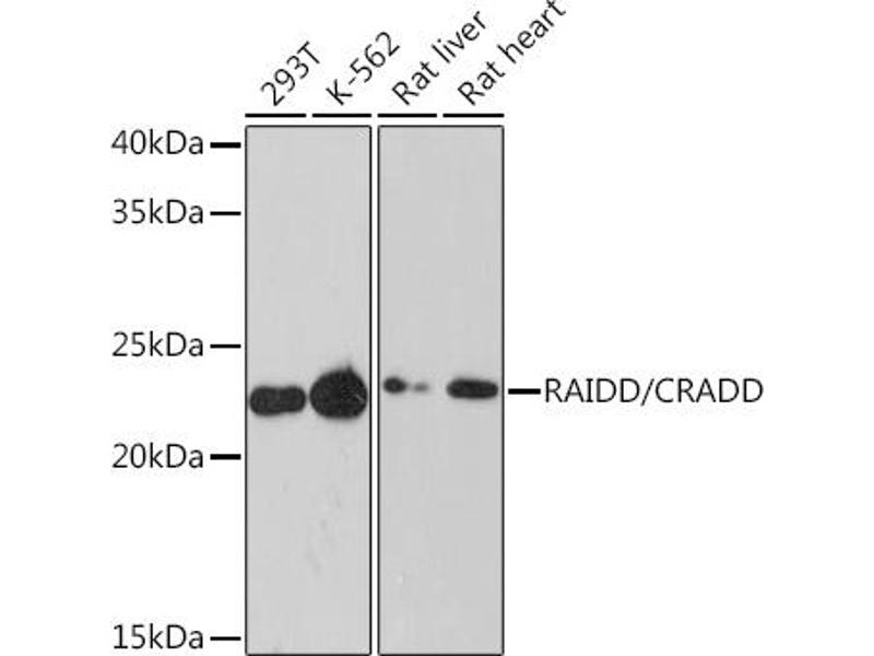 This gene encodes a protein containing a death domain (DD) motif. This protein recruits caspase 2/ICH1 to the cell death signal transduction complex, which includes tumor necrosis factor receptor 1 (TNFR1A) and RIPK1/RIP kinase, and acts in promoting apoptosis. A mutation in this gene was associated with mental retardation. A related pseudogene is found on chromosome 3. Alternative splicing results in multiple transcript variants. [provided by RefSeq, Feb 2016],MRT34, RAIDD,Apoptosis,Apoptosis_Mitochondrial Control of Apoptosis,Cancer,Cell Biology & Developmental Biology,Death Receptor Signaling Pathway,Invasion and Metastasis,CRADD
