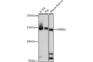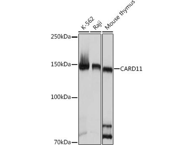 The protein encoded by this gene belongs to the membrane-associated guanylate kinase (MAGUK) family, a class of proteins that functions as molecular scaffolds for the assembly of multiprotein complexes at specialized regions of the plasma membrane. This protein is also a member of the CARD protein family, which is defined by carrying a characteristic caspase-associated recruitment domain (CARD). This protein has a domain structure similar to that of CARD14 protein. The CARD domains of both proteins have been shown to specifically interact with BCL10, a protein known to function as a positive regulator of cell apoptosis and NF-kappaB activation. When expressed in cells, this protein activated NF-kappaB and induced the phosphorylation of BCL10. [provided by RefSeq, Jul 2008],BENTA, BIMP3, CARMA1, IMD11, PPBL,Apoptosis,Apoptosis_Caspases,B Cell Receptor Signaling Pathway,Cancer,Cell Biology & Developmental Biology,Epigenetics & Nuclear Signaling,Immunology & Inflammation,Signal Transduction,T Cell Receptor Signaling Pathway,CARD11