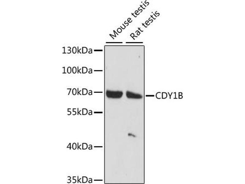 This gene encodes a protein containing a chromodomain and a histone acetyltransferase catalytic domain. Chromodomain proteins are components of heterochromatin-like complexes and can act as gene repressors. This protein is localized to the nucleus of late spermatids where histone hyperacetylation takes place. Histone hyperacetylation is thought to facilitate the transition in which protamines replace histones as the major DNA-packaging protein. The human chromosome Y has two identical copies of this gene within a palindromic region, this record represents the more centromeric copy. Chromosome Y also contains a pair of closely related genes in another more telomeric palindrome as well as several related pseudogenes. Two protein isoforms are encoded by transcript variants of this gene. Additional transcript variants have been described, but their full-length nature has not been determined.,CDY1B,CDY,Epigenetics & Nuclear Signaling,CDY1B