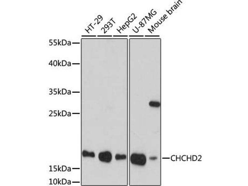 The protein encoded by this gene belongs to a class of eukaryotic CX(9)C proteins characterized by four cysteine residues spaced ten amino acids apart from one another. These residues form disulfide linkages that define a CHCH fold. In response to stress, the protein translocates from the mitochondrial intermembrane space to the nucleus where it binds to a highly conserved 13 nucleotide oxygen responsive element in the promoter of cytochrome oxidase 4I2, a subunit of the terminal enzyme of the electron transport chain. In concert with recombination signal sequence-binding protein J, binding of this protein activates the oxygen responsive element at four percent oxygen. In addition, it has been shown that this protein is a negative regulator of mitochondria-mediated apoptosis. In response to apoptotic stimuli, mitochondrial levels of this protein decrease, allowing BCL2-associated X protein to oligomerize and activate the caspase cascade. Pseudogenes of this gene are found on multiple chromosomes. Alternative splicing results in multiple transcript variants.,CHCHD2,C7orf17,MNRR1,NS2TP,PARK22,Cell Biology & Developmental Biology,CHCHD2