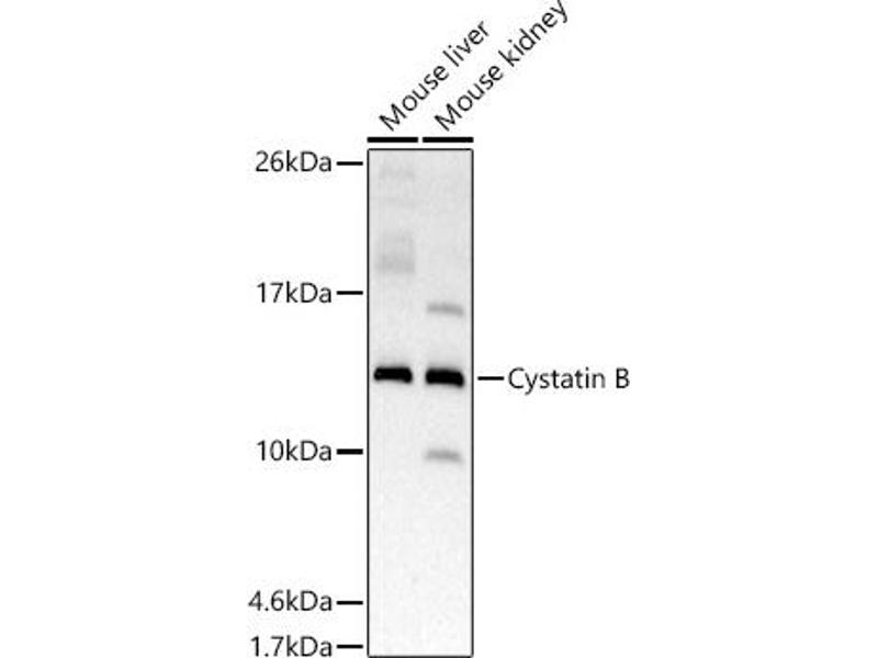 The cystatin superfamily encompasses proteins that contain multiple cystatin-like sequences. Some of the members are active cysteine protease inhibitors, while others have lost or perhaps never acquired this inhibitory activity. There are three inhibitory families in the superfamily, including the type 1 cystatins (stefins), type 2 cystatins and kininogens. This gene encodes a stefin that functions as an intracellular thiol protease inhibitor. The protein is able to form a dimer stabilized by noncovalent forces, inhibiting papain and cathepsins l, h and b. The protein is thought to play a role in protecting against the proteases leaking from lysosomes. Evidence indicates that mutations in this gene are responsible for the primary defects in patients with progressive myoclonic epilepsy (EPM1). One type of mutation responsible for EPM1 is the expansion in the promoter region of this gene of a CCCCGCCCCGCG repeat from 2-3 copies to 30-78 copies.,CSTB,CPI-B,CST6,EPM1,EPM1A,PME,STFB,ULD,Epigenetics & Nuclear Signaling,RNA Binding,Cell Biology & Developmental Biology,Ubiquitin,Cystatin B