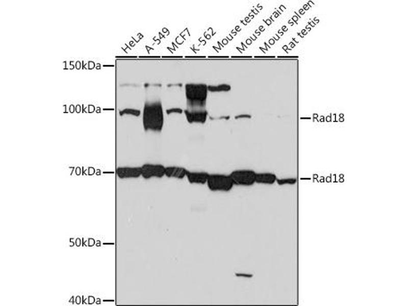 The protein encoded by this gene is highly similar to S. cerevisiae DNA damage repair protein Rad18. Yeast Rad18 functions through its interaction with Rad6, which is an ubiquitin-conjugating enzyme required for post-replication repair of damaged DNA. Similar to its yeast counterpart, this protein is able to interact with the human homolog of yeast Rad6 protein through a conserved ring-finger motif. Mutation of this motif results in defective replication of UV-damaged DNA and hypersensitivity to multiple mutagens. [provided by RefSeq, Jul 2008],RNF73,Cell Biology & Developmental Biology,Epigenetics & Nuclear Signaling,Ubiquitin,RAD18