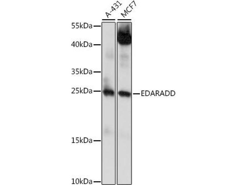 This gene was identified by its association with ectodermal dysplasia, a genetic disorder characterized by defective development of hair, teeth, and eccrine sweat glands. The protein encoded by this gene is a death domain-containing protein, and is found to interact with EDAR, a death domain receptor known to be required for the development of hair, teeth and other ectodermal derivatives. This protein and EDAR are coexpressed in epithelial cells during the formation of hair follicles and teeth. Through its interaction with EDAR, this protein acts as an adaptor, and links the receptor to downstream signaling pathways. Two alternatively spliced transcript variants of this gene encoding distinct isoforms have been reported.,EDARADD,ECTD11A,ECTD11B,ED3,EDA3,Epigenetics & Nuclear Signaling,Signal Transduction,Cell Biology & Developmental Biology,EDARADD