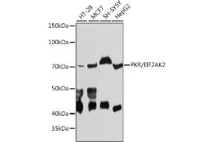 The protein encoded by this gene is a serine/threonine protein kinase that is activated by autophosphorylation after binding to dsRNA. The activated form of the encoded protein can phosphorylate translation initiation factor EIF2S1, which in turn inhibits protein synthesis. This protein is also activated by manganese ions and heparin. Three transcript variants encoding two different isoforms have been found for this gene. [provided by RefSeq, Oct 2011],EIF2AK1,PKR,PPP1R83,PRKR,Eif2ak2,EIF2AK2,Apoptosis,Autophagy,Cell Biology & Developmental Biology,Epigenetics & Nuclear Signaling,Immunology & Inflammation,Kinase,Kinase_Serine/threonine kinases,Protein phosphorylation,Signal Transduction,Translation Control,Translational Control_Regulation of eIF2,EIF2AK2