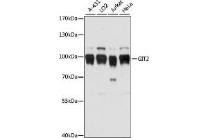 This gene encodes a member of the GIT protein family, which interact with G protein-coupled receptor kinases and possess ADP-ribosylation factor (ARF) GTPase-activating protein (GAP) activity. GIT proteins traffic between cytoplasmic complexes, focal adhesions, and the cell periphery, and interact with Pak interacting exchange factor beta (PIX) to form large oligomeric complexes that transiently recruit other proteins. GIT proteins regulate cytoskeletal dynamics and participate in receptor internalization and membrane trafficking. This gene has been shown to repress lamellipodial extension and focal adhesion turnover, and is thought to regulate cell motility. This gene undergoes extensive alternative splicing to generate multiple isoforms, but the full-length nature of some of these variants has not been determined. The various isoforms have functional differences, with respect to ARF GAP activity and to G protein-coupled receptor kinase 2 binding.,GIT2,CAT-2,CAT2,PKL,Signal Transduction,G protein signaling,G-Protein-Coupled Receptors(GPCR),Kinase,Cell Biology & Developmental Biology,Cytoskeleton,Actins,GIT2