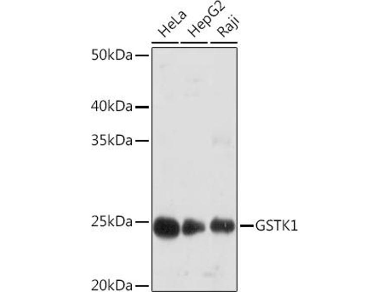 This gene encodes a member of the kappa class of the glutathione transferase superfamily of enzymes that function in cellular detoxification. The encoded protein is localized to the peroxisome and catalyzes the conjugation of glutathione to a wide range of hydrophobic substates facilitating the removal of these compounds from cells. Alternative splicing results in multiple transcript variants.[provided by RefSeq, Jan 2009],GST, GST 13-13, GST13, GST13-13, GSTK1-1, hGSTK1,Drug metabolism,Endocrine & Metabolism,Mitochondrial metabolism,Mitochondrial metabolism_Mitochondrial markers,GSTK1