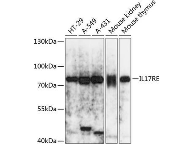 This gene encodes a transmembrane protein that functions as the receptor for interleukin-17C. The encoded protein signals to downstream components of the mitogen activated protein kinase (MAPK) pathway. Activity of this protein is important in the immune response to bacterial pathogens. Alternatively spliced transcript variants have been described for this gene.,IL17RE,Immunology & Inflammation,Cytokines,Interleukins,Cell Intrinsic Innate Immunity Signaling Pathway,IL17RE