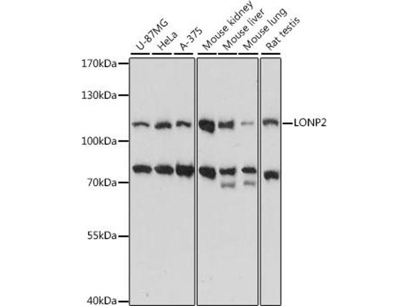 In human, peroxisomes function primarily to catalyze fatty acid beta-oxidation and, as a by-product, produce hydrogen peroxide and superoxide. The protein encoded by this gene is an ATP-dependent protease that likely plays a role in maintaining overall peroxisome homeostasis as well as proteolytically degrading peroxisomal proteins damaged by oxidation. The protein has an N-terminal Lon N substrate recognition domain, an ATPase domain, a proteolytic domain, and, in some isoforms, a C-terminal peroxisome targeting sequence. Alternative splicing results in multiple transcript variants encoding distinct isoforms.,LONP2,LONP,LONPL,PLON,PSLON,Cell Biology & Developmental Biology,Ubiquitin,LONP2