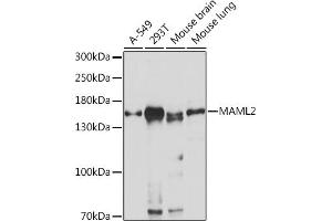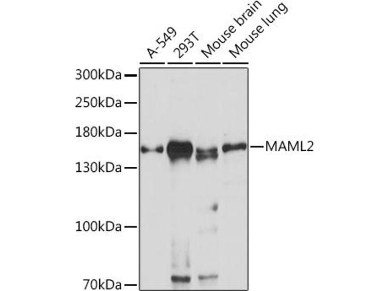The protein encoded by this gene is a member of the Mastermind-like family of proteins. All family members are proline and glutamine-rich, and contain a conserved basic domain that binds the ankyrin repeat domain of the intracellular domain of the Notch receptors (ICN1-4) in their N-terminus, and a transcriptional activation domain in their C-terminus. This protein binds to an extended groove that is formed by the interaction of CBF1, Suppressor of Hairless, LAG-1 (CSL) with ICN, and positively regulates Notch signaling. High levels of expression of this gene have been observed in several B cell-derived lymphomas. Translocations resulting in fusion proteins with both CRTC1 and CRTC3 have been implicated in the development of mucoepidermoid carcinomas, while a translocation event with CXCR4 has been linked with chronic lymphocytic leukemia (CLL). Copy number variation in the polyglutamine tract has been observed.,MAML2,MAM-3,MAM2,MAM3,MLL-MAML2,Epigenetics & Nuclear Signaling,Signal Transduction,Cell Biology & Developmental Biology,Notch Signaling Pathway,Stem Cells,MAML2