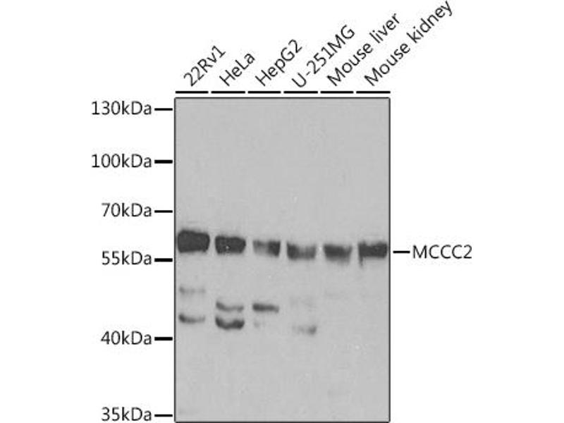 This gene encodes the small subunit of 3-methylcrotonyl-CoA carboxylase. This enzyme functions as a heterodimer and catalyzes the carboxylation of 3-methylcrotonyl-CoA to form 3-methylglutaconyl-CoA. Mutations in this gene are associated with 3-Methylcrotonylglycinuria, an autosomal recessive disorder of leucine catabolism.,MCCC2,MCCB,Signal Transduction,Endocrine & Metabolism,Mitochondrial metabolism,Mitochondrial markers,Amino acid metabolism,MCCC2