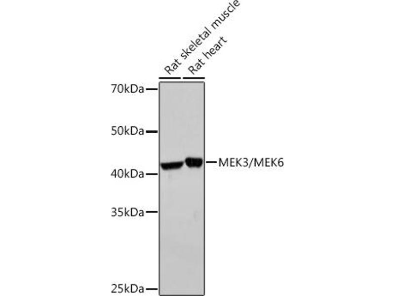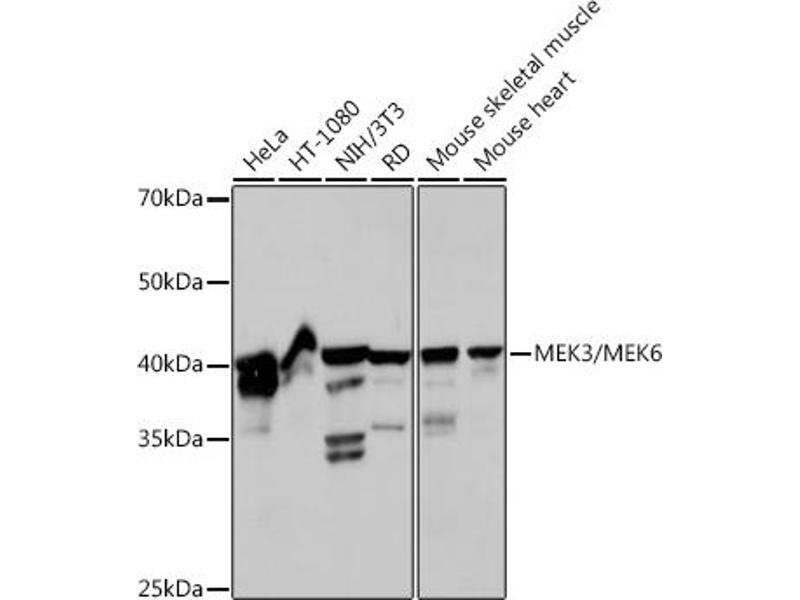 Der Kaninchen Monoklonal anti-MAP2K6 Antikörper (ABIN7268643) detektiert spezifisch MAP2K6 in WB.