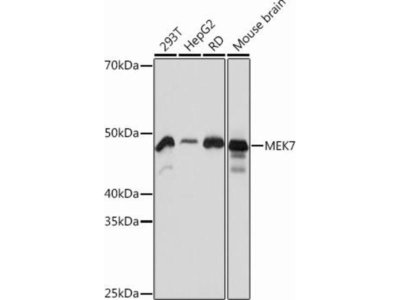 The protein encoded by this gene is a dual specificity protein kinase that belongs to the MAP kinase kinase family. This kinase specifically activates MAPK8/JNK1 and MAPK9/JNK2, and this kinase itself is phosphorylated and activated by MAP kinase kinase kinases including MAP3K1/MEKK1, MAP3K2/MEKK2,MAP3K3/MEKK5, and MAP4K2/GCK. This kinase is involved in the signal transduction mediating the cell responses to proinflammatory cytokines, and environmental stresses. Alternative splicing results in multiple transcript variants. [provided by RefSeq, Jul 2014],JNKK2, MAPKK7, MEK, MEK 7, MKK7, PRKMK7, SAPKK-4, SAPKK4,B Cell Receptor Signaling Pathway,Cell Biology & Developmental Biology,Cell Intrinsic Innate Immunity Signaling Pathway,Cytoskeleton,Cytoskeleton_Actins,Death Receptor Signaling Pathway,Endocrine & Metabolism,ErbB-HER Signaling Pathway,G protein signaling,G protein signaling_G-Protein-Coupled Receptors Signaling to MAPK/Erk,IL-6 Receptor Signaling Pathway,Immunology & Inflammation,Innate Immunity_TLR Signaling,Kinase,MAPK-JNK Signaling Pathway,Neurodegenerative Diseases,Neurodegenerative Diseases_Dopamine Signaling in Parkinsons Disease,Neuroscience,Protein phosphorylation,Signal Transduction,T Cell Receptor Signaling Pathway,Toll-like Receptor Signaling Pathway,MAP2K7