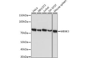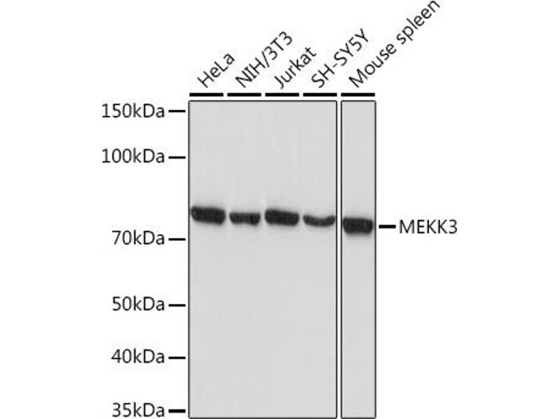 This gene product is a 626-amino acid polypeptide that is 96.5 % identical to mouse Mekk3. Its catalytic domain is closely related to those of several other kinases, including mouse Mekk2, tobacco NPK, and yeast Ste11. Northern blot analysis revealed a 4.6-kb transcript that appears to be ubiquitously expressed. This protein directly regulates the stress-activated protein kinase (SAPK) and extracellular signal-regulated protein kinase (ERK) pathways by activating SEK and MEK1/2 respectively, it does not regulate the p38 pathway. In cotransfection assays, it enhanced transcription from a nuclear factor kappa-B (NFKB)-dependent reporter gene, consistent with a role in the SAPK pathway. Alternatively spliced transcript variants encoding distinct isoforms have been observed. [provided by RefSeq, Jul 2008],MAPKKK3, MEKK3,B Cell Receptor Signaling Pathway,Cell Biology & Developmental Biology,Cell Intrinsic Innate Immunity Signaling Pathway,Cytoskeleton,Cytoskeleton_Actins,Immunology & Inflammation,Innate Immunity_TLR Signaling,Kinase,Kinase_Serine/threonine kinases,MAPK-JNK Signaling Pathway,MAPK-P38 Signaling Pathway,Signal Transduction,Toll-like Receptor Signaling Pathway,MAP3K3