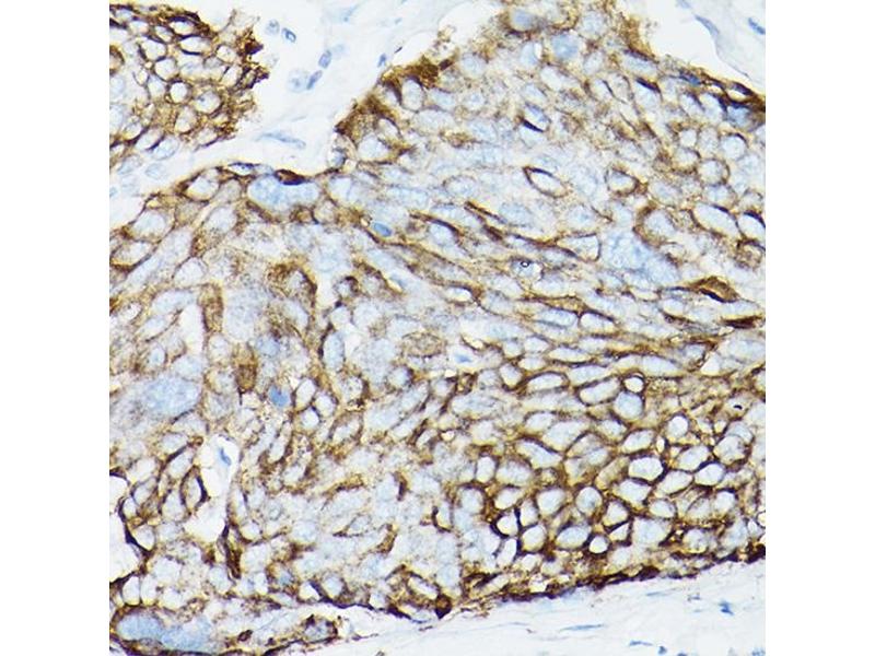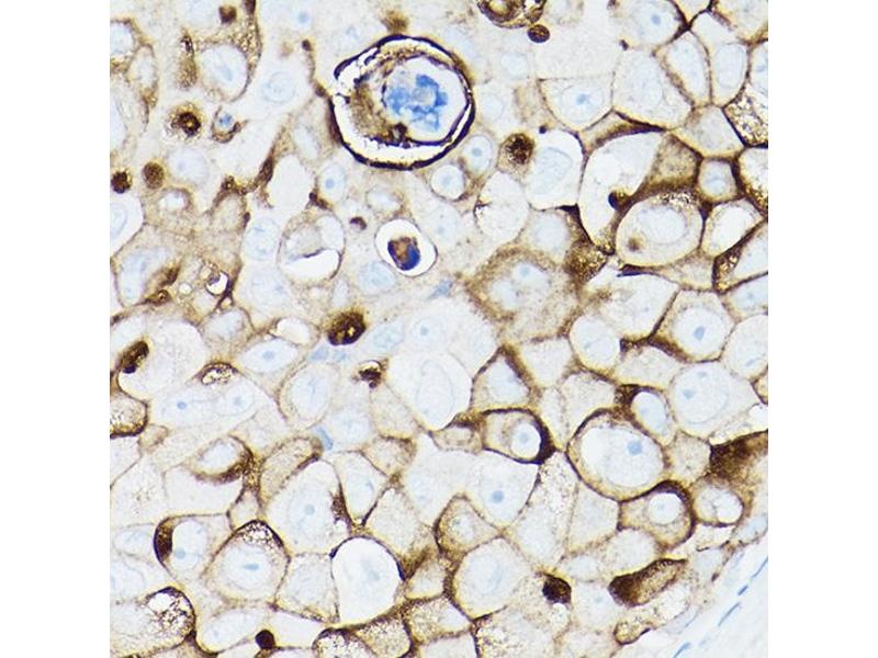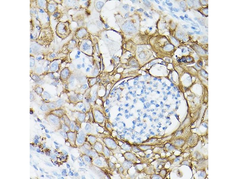 - This gene encodes a membrane-bound protein that is a member of the mucin family. Mucins are O-glycosylated proteins that play an essential role in forming protective mucous barriers on epithelial surfaces. These proteins also play a role in intracellular signaling. This protein is expressed on the apical surface of epithelial cells that line the mucosal surfaces of many different tissues including lung, breast stomach and pancreas. This protein is proteolytically cleaved into alpha and beta subunits that form a heterodimeric complex. The N-terminal alpha subunit functions in cell-adhesion and the C-terminal beta subunit is involved in cell signaling. Overexpression, aberrant intracellular localization, and changes in glycosylation of this protein have been associated with carcinomas. This gene is known to contain a highly polymorphic variable number tandem repeats (VNTR) domain. Alternate splicing results in multiple transcript variants.[provided by RefSeq, Feb 2011],ADMCKD,ADMCKD1,CA 15-3,CD227,EMA,H23AG,KL-6,MAM6,MCD,MCKD,MCKD1,MUC-1,MUC-1/SEC,MUC-1/X,MUC1/ZD,PEM,PEMT,PUM,MUC1,CA15-3,mucin-1,Cancer,CDs,Cell Biology & Developmental Biology,Cytoskeleton,ErbB-HER Signaling Pathway,Extracellular Matrix,Immunology & Inflammation,Invasion and Metastasis,Protein phosphorylation,Signal Transduction,Tumor immunology,Tumor immunology_Tumor-associated antigens,MUC1