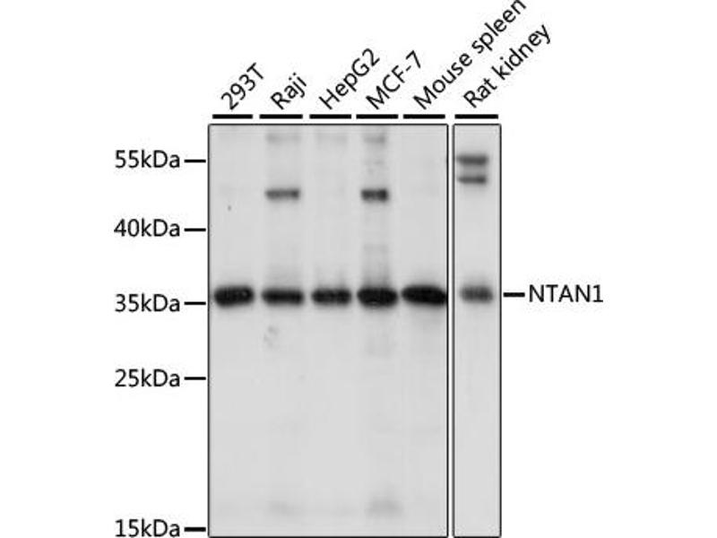 Der Kaninchen Polyklonal anti-NTAN1 Antikörper (ABIN7268787) detektiert spezifisch NTAN1 in WB.