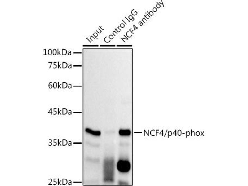 The protein encoded by this gene is a cytosolic regulatory component of the superoxide-producing phagocyte NADPH-oxidase, a multicomponent enzyme system important for host defense. This protein is preferentially expressed in cells of myeloid lineage. It interacts primarily with neutrophil cytosolic factor 2 (NCF2/p67-phox) to form a complex with neutrophil cytosolic factor 1 (NCF1/p47-phox), which further interacts with the small G protein RAC1 and translocates to the membrane upon cell stimulation. This complex then activates flavocytochrome b, the membrane-integrated catalytic core of the enzyme system. The PX domain of this protein can bind phospholipid products of the PI(3) kinase, which suggests its role in PI(3) kinase-mediated signaling events. The phosphorylation of this protein was found to negatively regulate the enzyme activity. Alternatively spliced transcript variants encoding distinct isoforms have been observed.,NCF4, CGD3, NCF, P40PHOX, SH3PXD4, neutrophil cytosol factor 4,Cancer,Signal Transduction,Cell Biology & Developmental Biology,Endocrine & Metabolism,Mitochondrial metabolism,Mitochondrial markers,NCF4