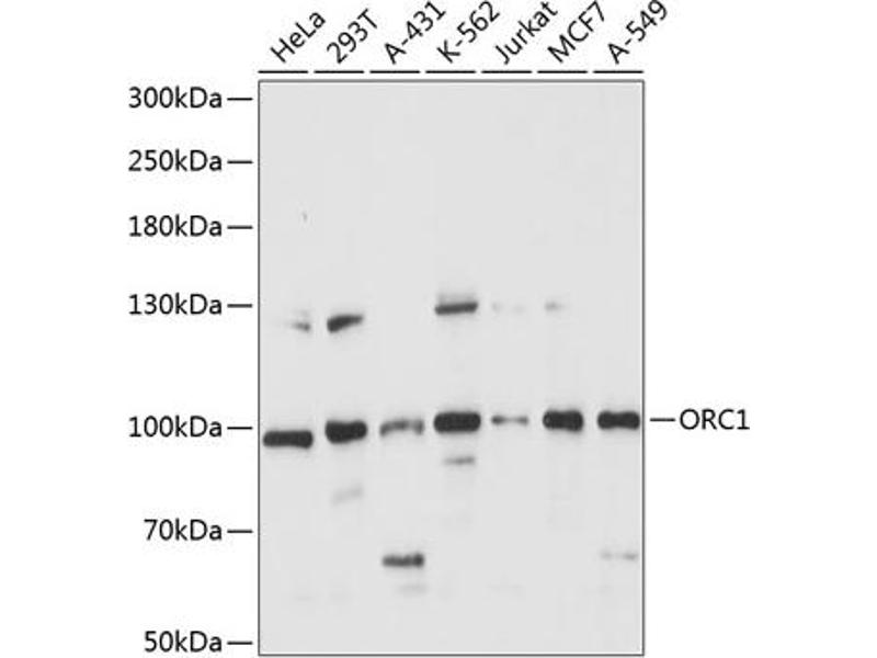 The origin recognition complex (ORC) is a highly conserved six subunits protein complex essential for the initiation of the DNA replication in eukaryotic cells. Studies in yeast demonstrated that ORC binds specifically to origins of replication and serves as a platform for the assembly of additional initiation factors such as Cdc6 and Mcm proteins. The protein encoded by this gene is the largest subunit of the ORC complex. While other ORC subunits are stable throughout the cell cycle, the levels of this protein vary during the cell cycle, which has been shown to be controlled by ubiquitin-mediated proteolysis after initiation of DNA replication. This protein is found to be selectively phosphorylated during mitosis. It is also reported to interact with MYST histone acetyltransferase 2 (MyST2/HBO1), a protein involved in control of transcription silencing. Alternatively spliced transcript variants encoding different isoforms have been found for this gene.,ORC1,HSORC1,ORC1L,PARC1,Epigenetics & Nuclear Signaling,Cell Biology & Developmental Biology,Cell Cycle,Centrosome,ORC1