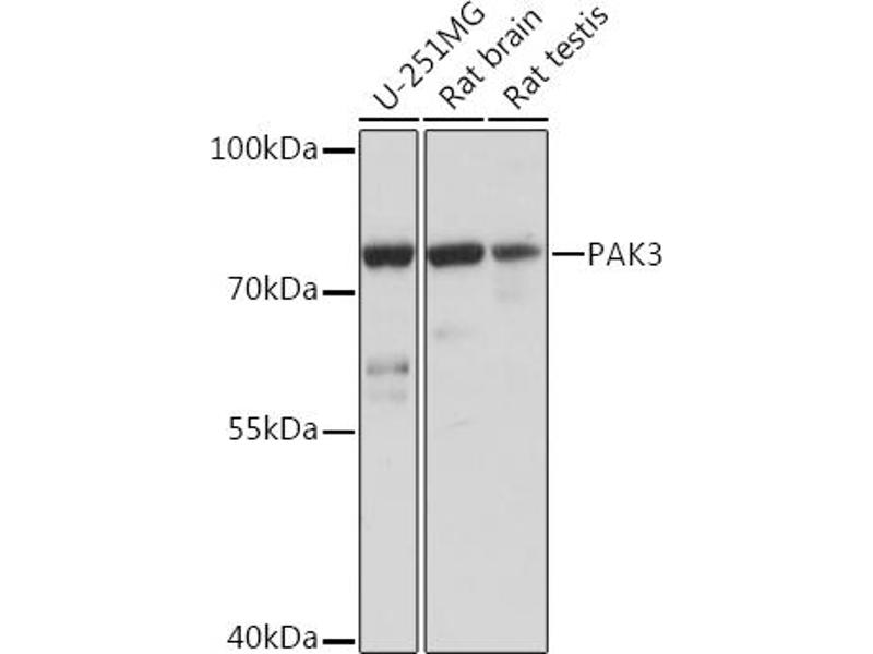 The protein encoded by this gene is a serine-threonine kinase and forms an activated complex with GTP-bound RAS-like (P21), CDC2 and RAC1. This protein may be necessary for dendritic development and for the rapid cytoskeletal reorganization in dendritic spines associated with synaptic plasticity. Defects in this gene are the cause of non-syndromic mental retardation X-linked type 30 (MRX30), also called X-linked mental retardation type 47 (MRX47). Alternatively spliced transcript variants encoding different isoforms have been identified.,PAK3,ARA,MRX30,MRX47,OPHN3,PAK-3,PAK3beta,bPAK,beta-PAK,Signal Transduction,G protein signaling,Signal Transduction,Kinase,Serine/threonine kinases,MAPK-Erk Signaling Pathway,Cell Biology & Developmental Biology,Microtubules,TGF-b-Smad Signaling Pathway,Neuroscience,PAK3